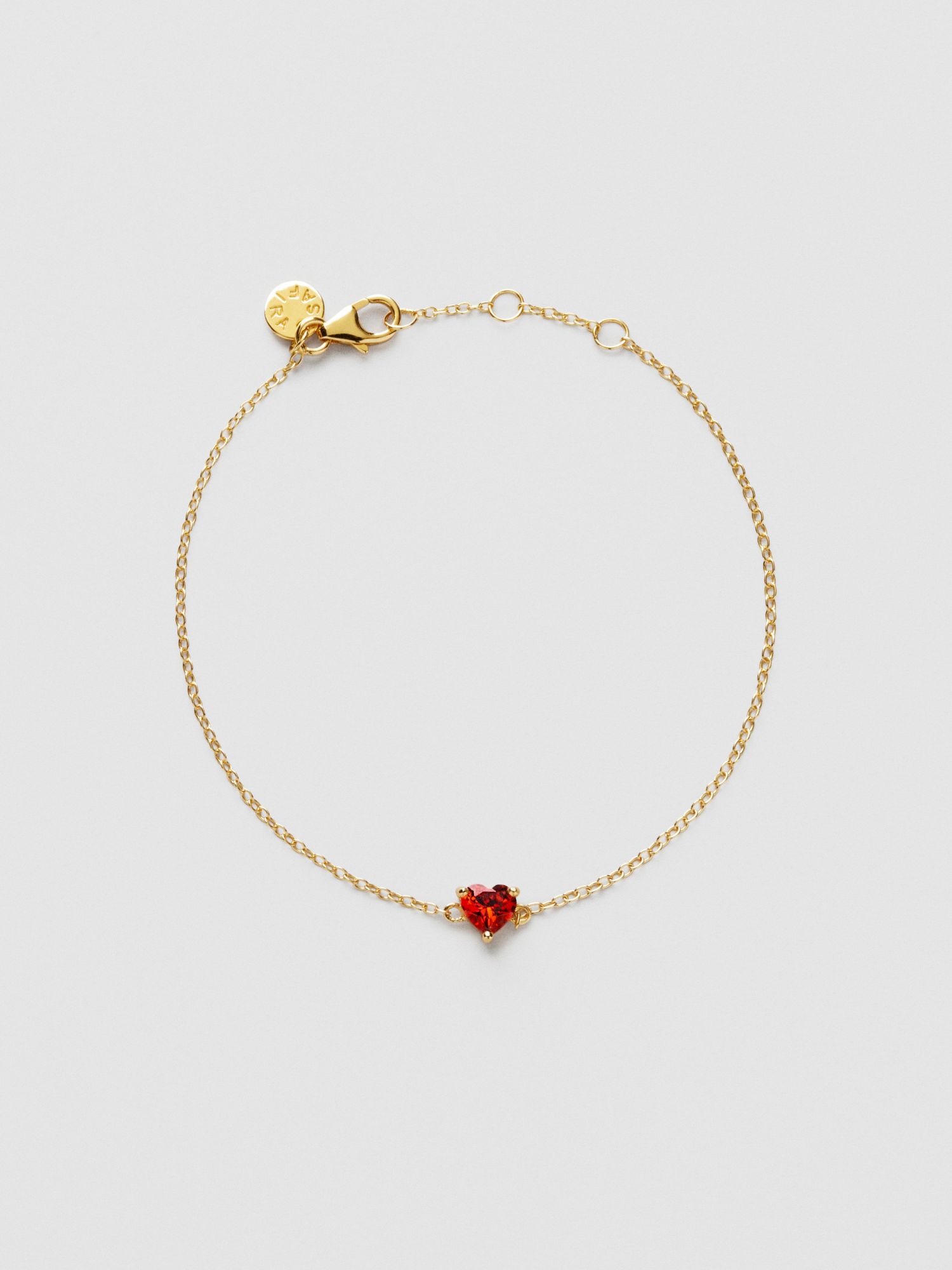Bracelet in genuine 925 sterling silver, decorated with a red heart-shaped Cubic Zirconia stone. The gold bracelet is plated with genuine 18K gold and has a core of genuine 925 sterling silver. This product is made of 100% recycled silver.