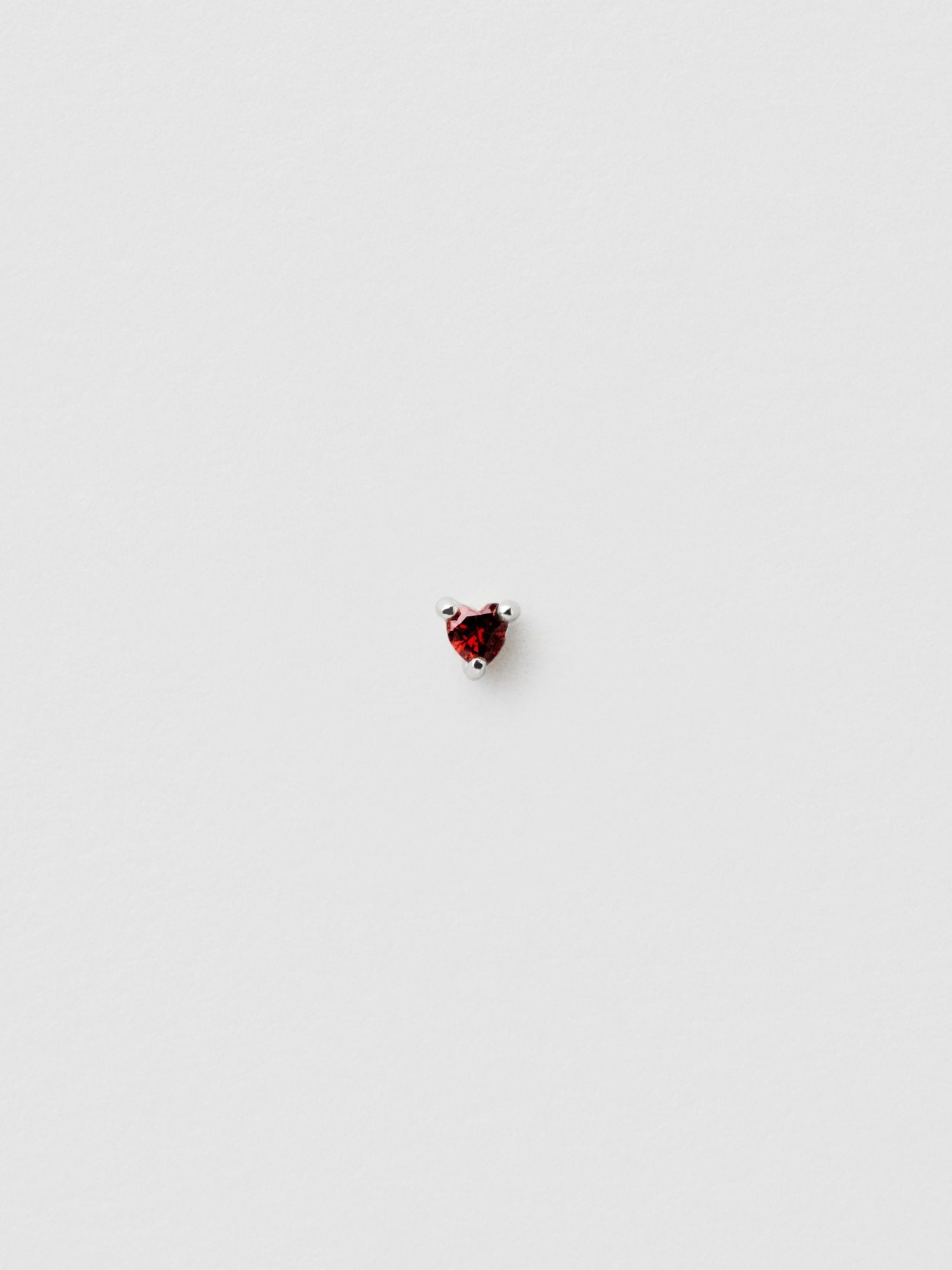 Heart shaped piercing in genuine 925 sterling silver, with a red Cubic Zirconia stone. The gold jewellery is plated with genuine 18K gold and has a core of genuine 925 sterling silver. The bar is made of genuine 925 sterling silver. This product is made of 100% recycled silver. Place the back part of the piercing through the ear from behind and screw it together with the front part of the piercing.