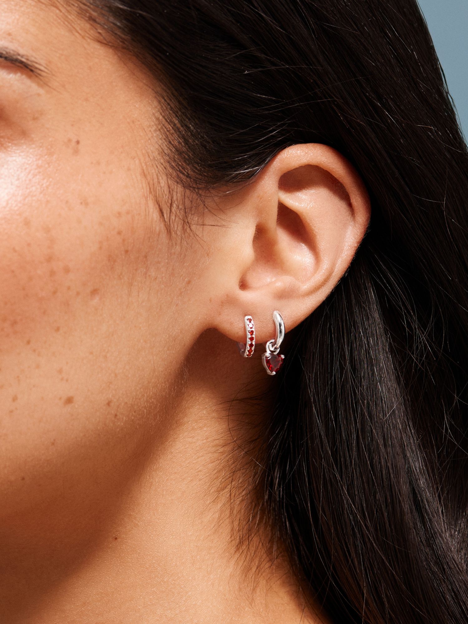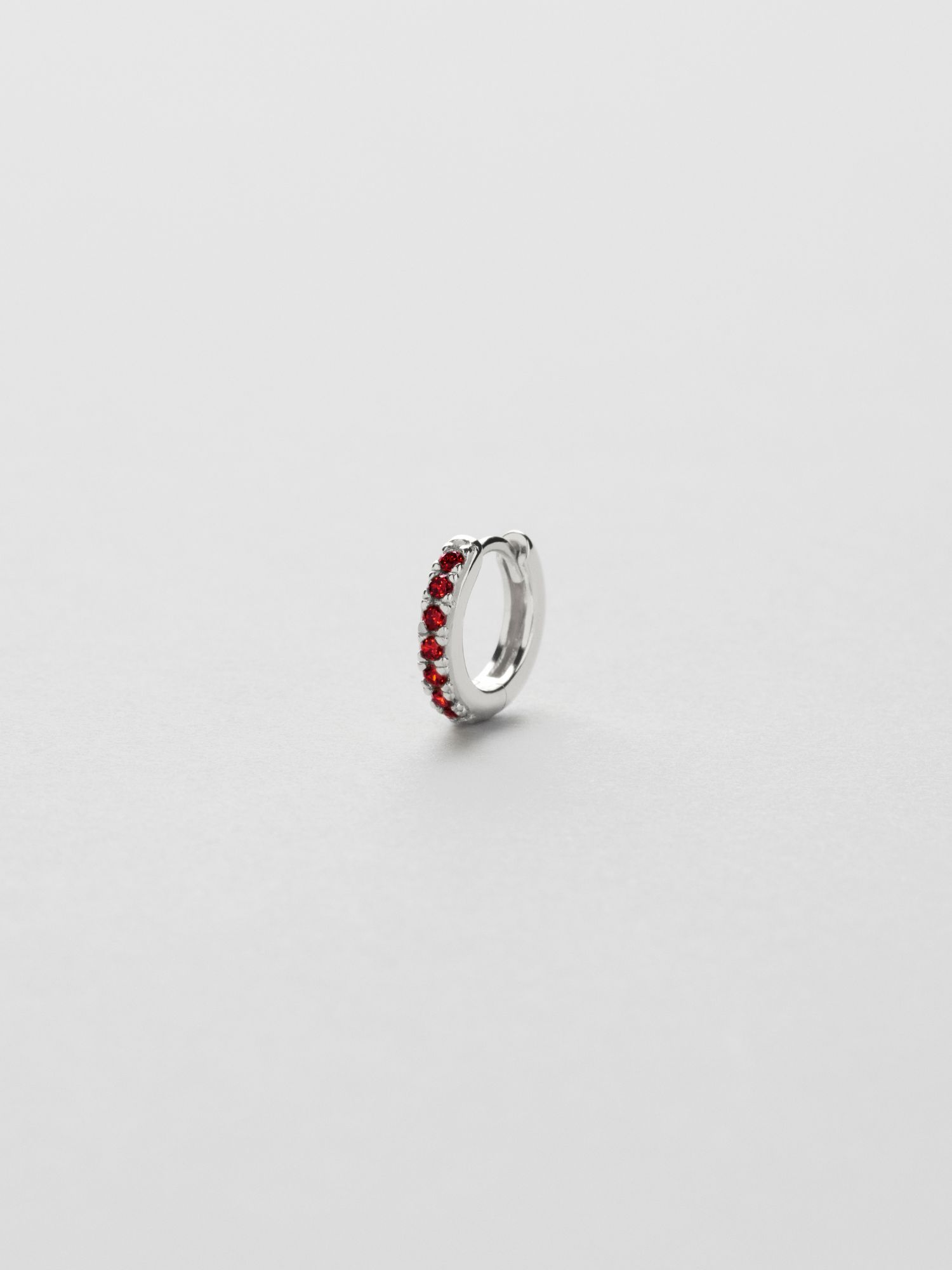 Huggie hoop in genuine 925 sterling silver, decorated with red Cubic Zirconia stones. The gold jewellery is plated with genuine 18K gold and has a core of genuine 925 sterling silver. This product is made from 100% recycled silver.