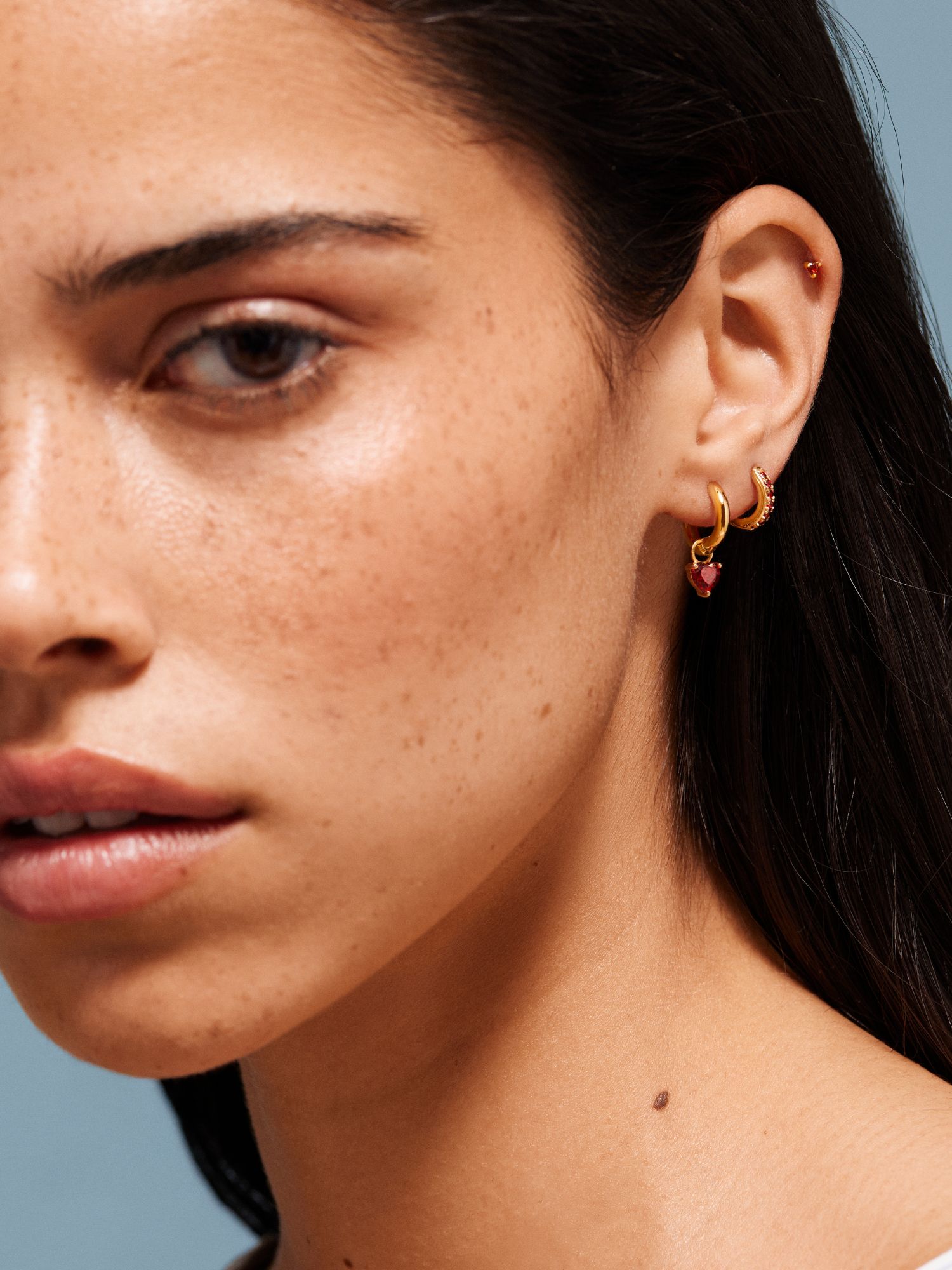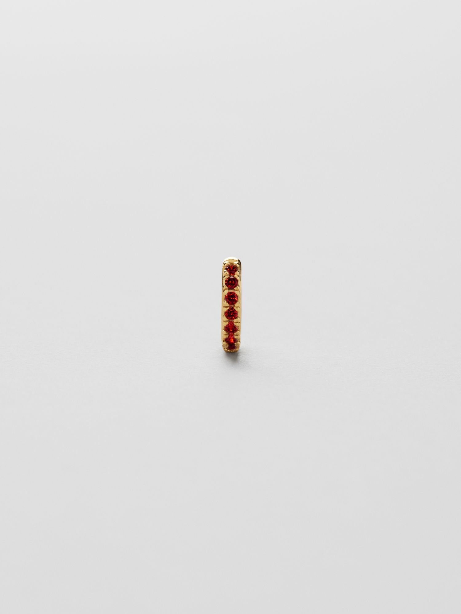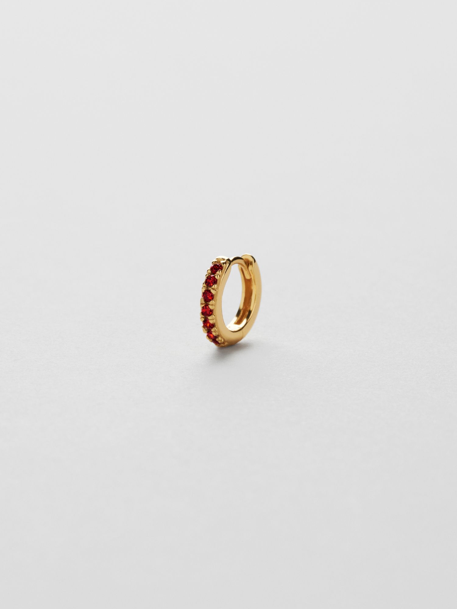 Huggie hoop in genuine 925 sterling silver, decorated with red Cubic Zirconia stones. The gold jewellery is plated with genuine 18K gold and has a core of genuine 925 sterling silver. This product is made from 100% recycled silver.