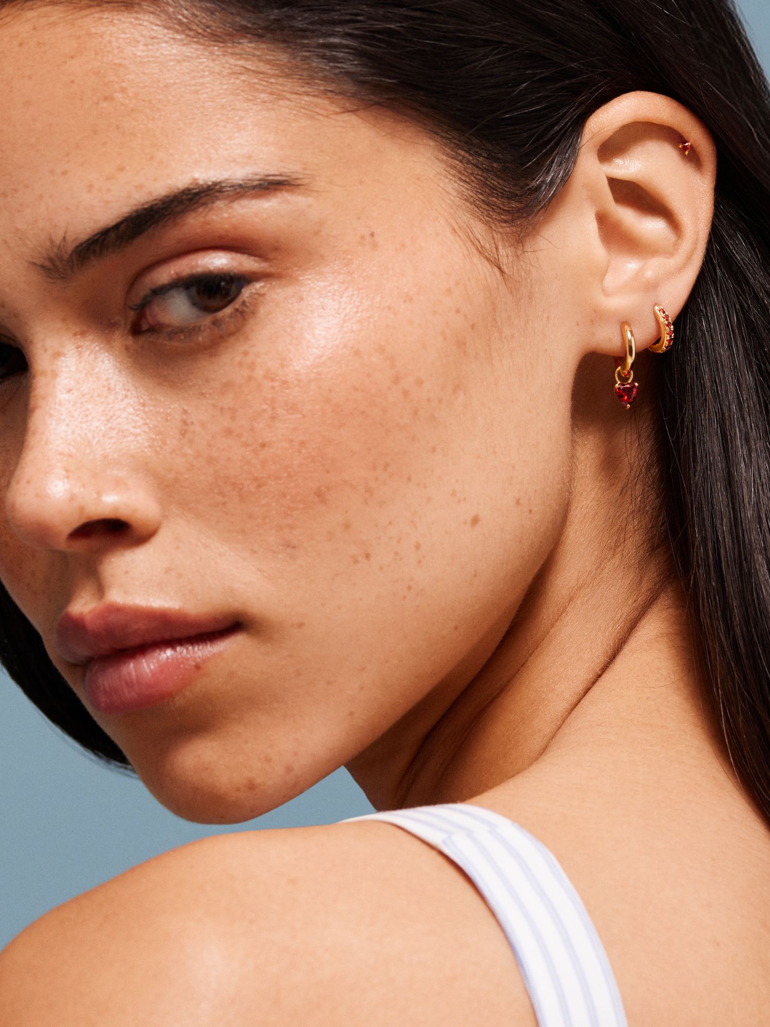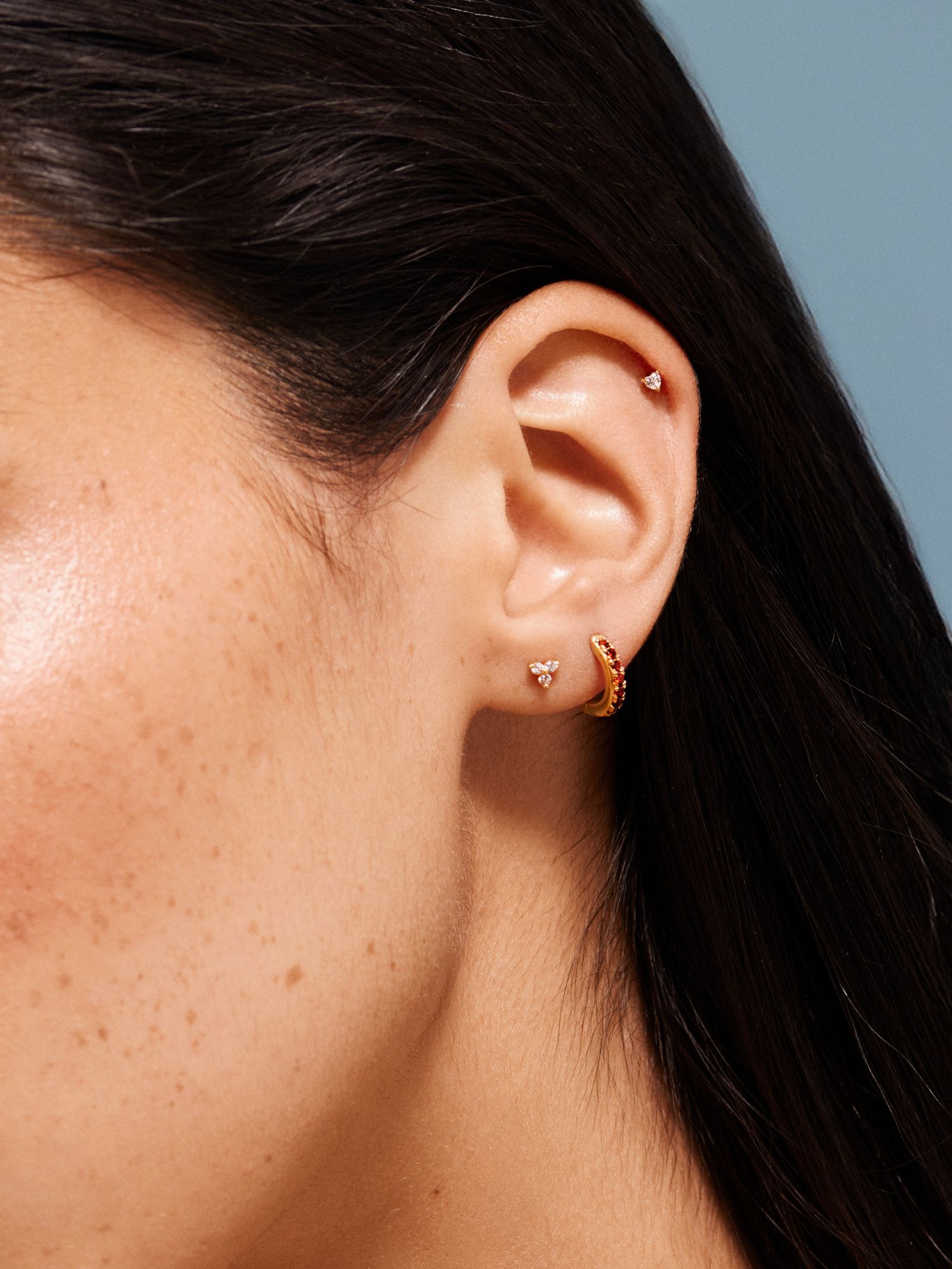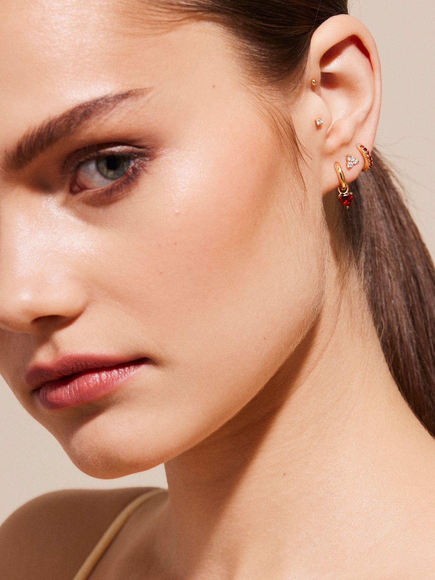 Huggie hoop in genuine 925 sterling silver, decorated with red Cubic Zirconia stones. The gold jewellery is plated with genuine 18K gold and has a core of genuine 925 sterling silver. This product is made from 100% recycled silver.
