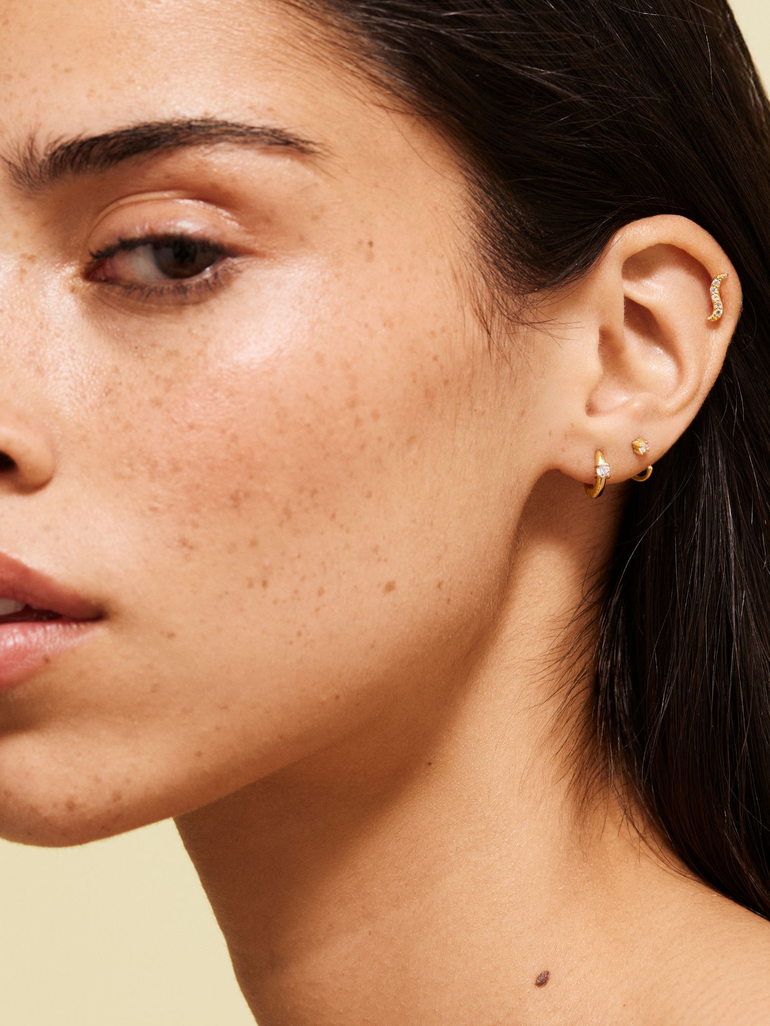 Open huggie hoop in genuine 925 sterling silver, decorated with a clear Cubic Zirconia stone. The gold earring is plated with genuine 24K gold and has a core of genuine 925 sterling silver. This product is made from 100% recycled silver.