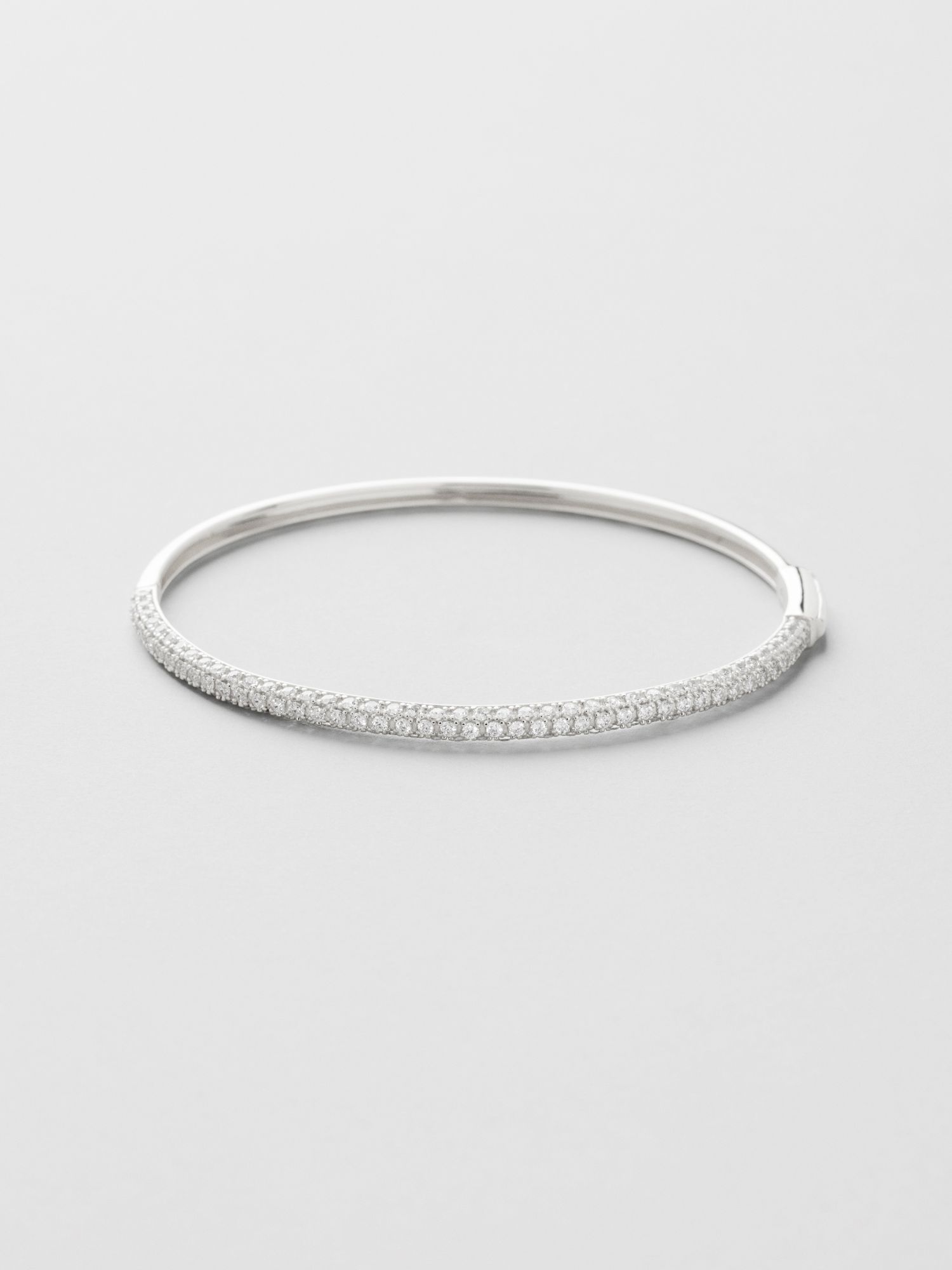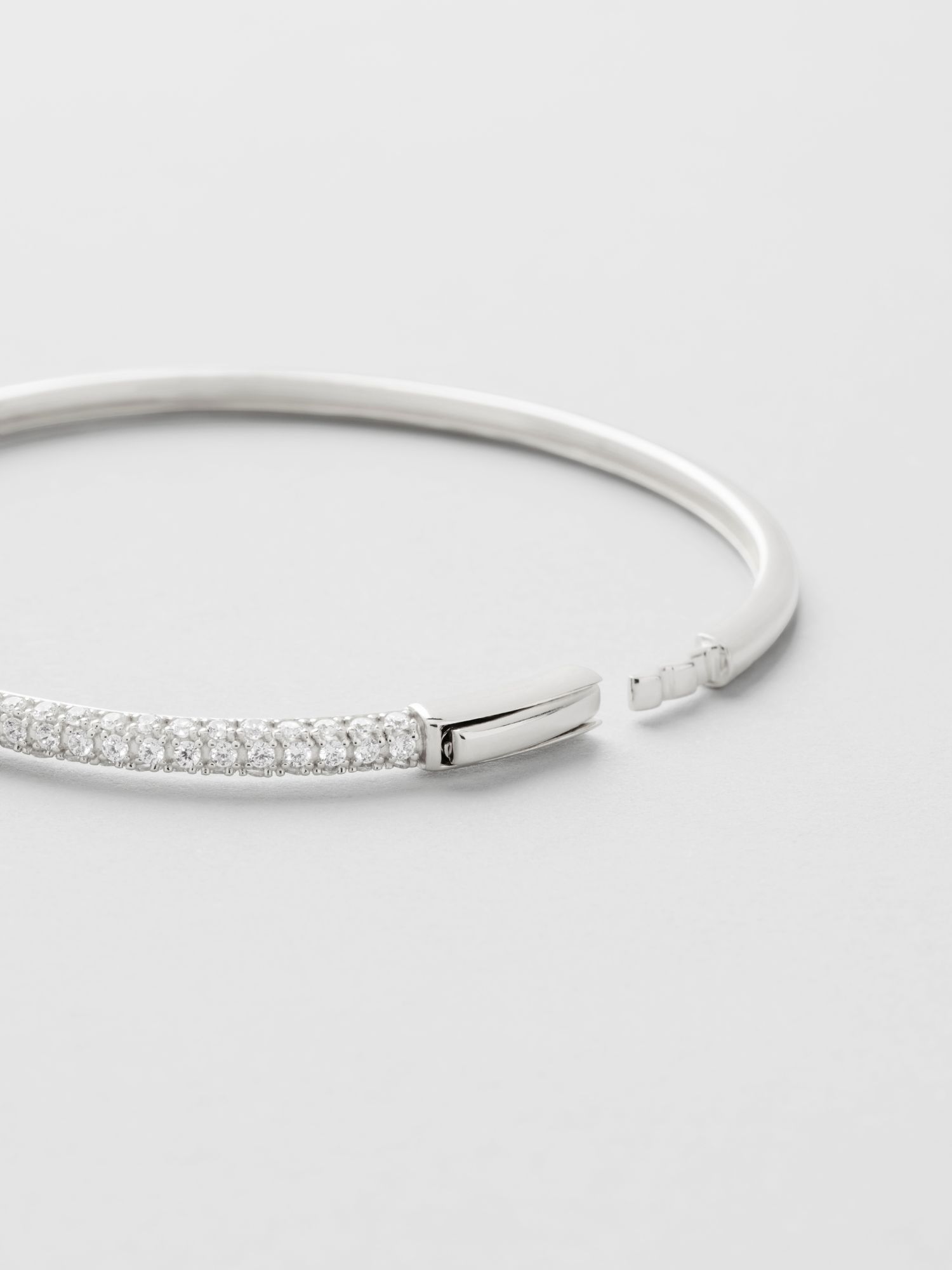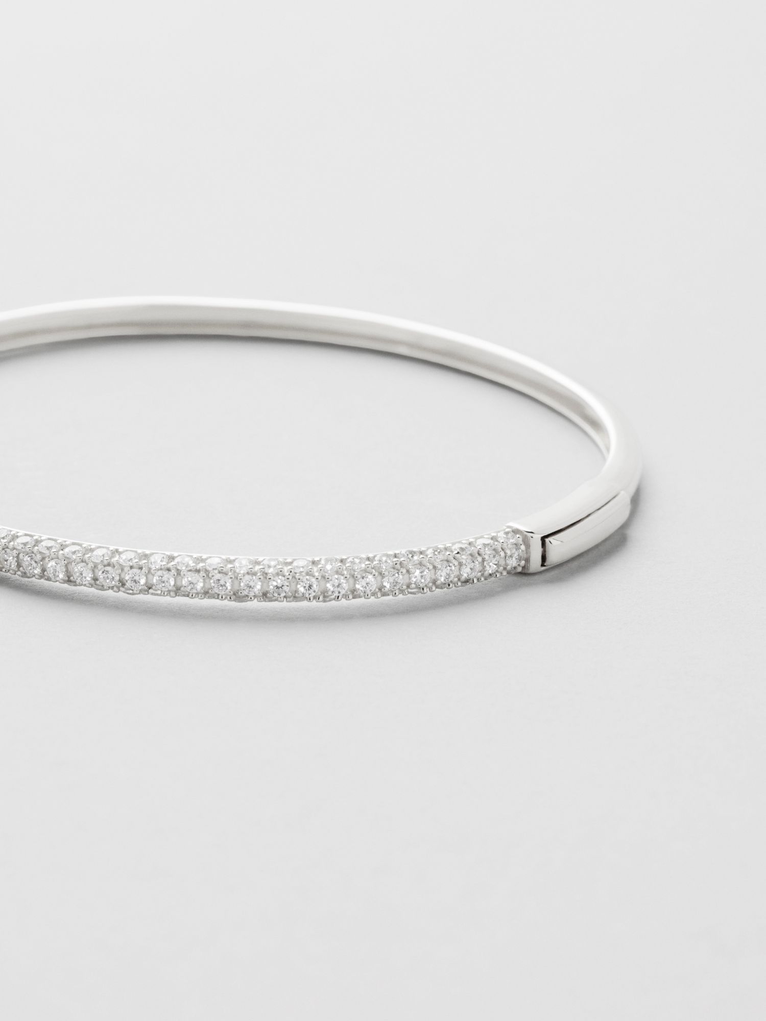 Bangle bracelet in genuine 925 sterling silver, decorated with clear Cubic Zirconia stones. The gold bracelet is plated with genuine 24K gold and has a core of genuine 925 sterling silver. This product is made of 100% recycled silver.