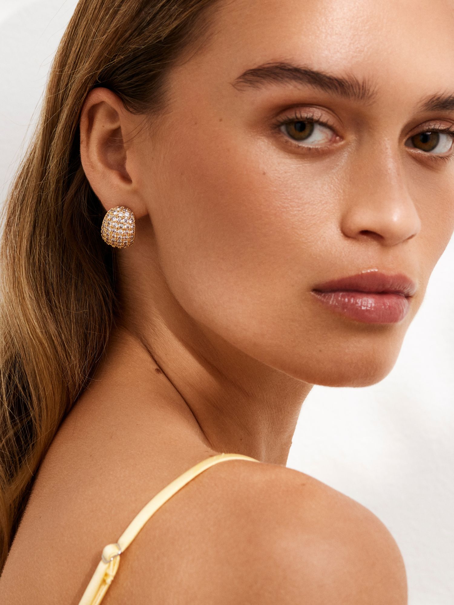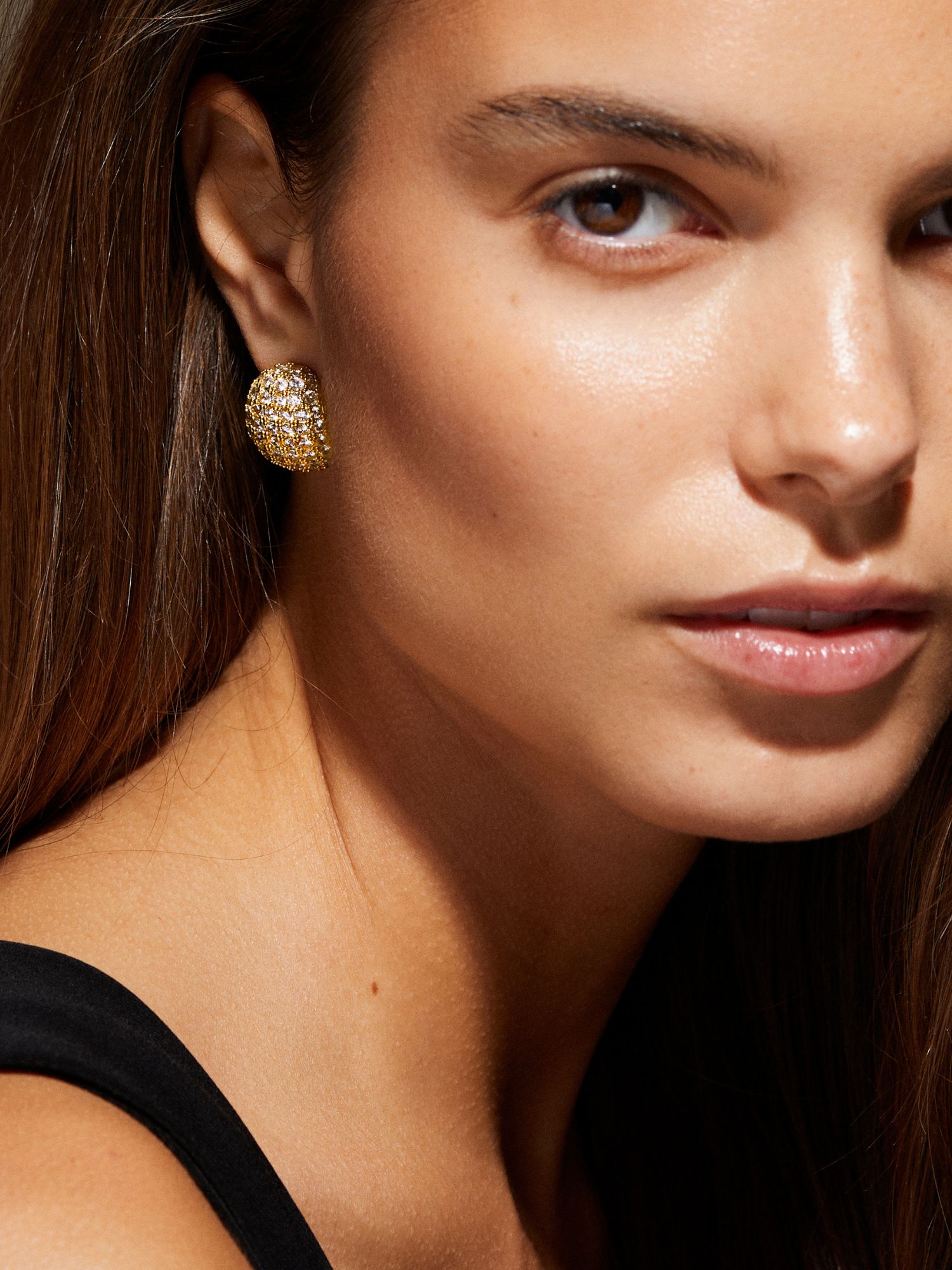 Earrings decorated with clear Cubic Zirconia stones, gilded with genuine 925 sterling silver or genuine 18K gold. The core is made of brass. This jewellery is 100% recycled.