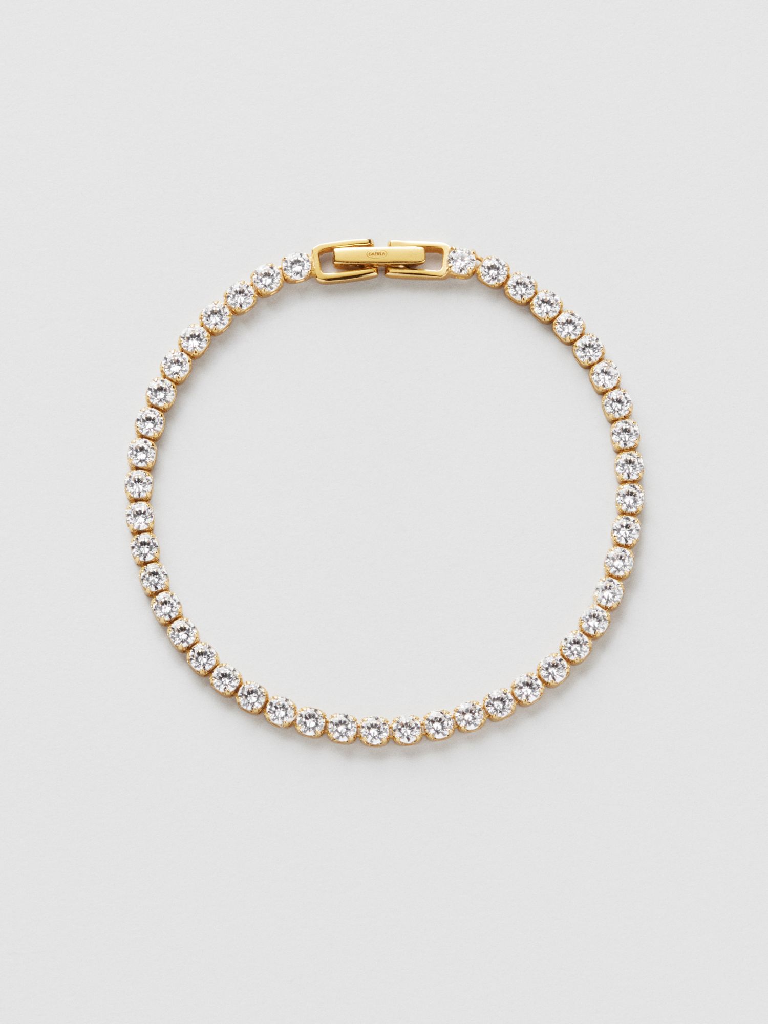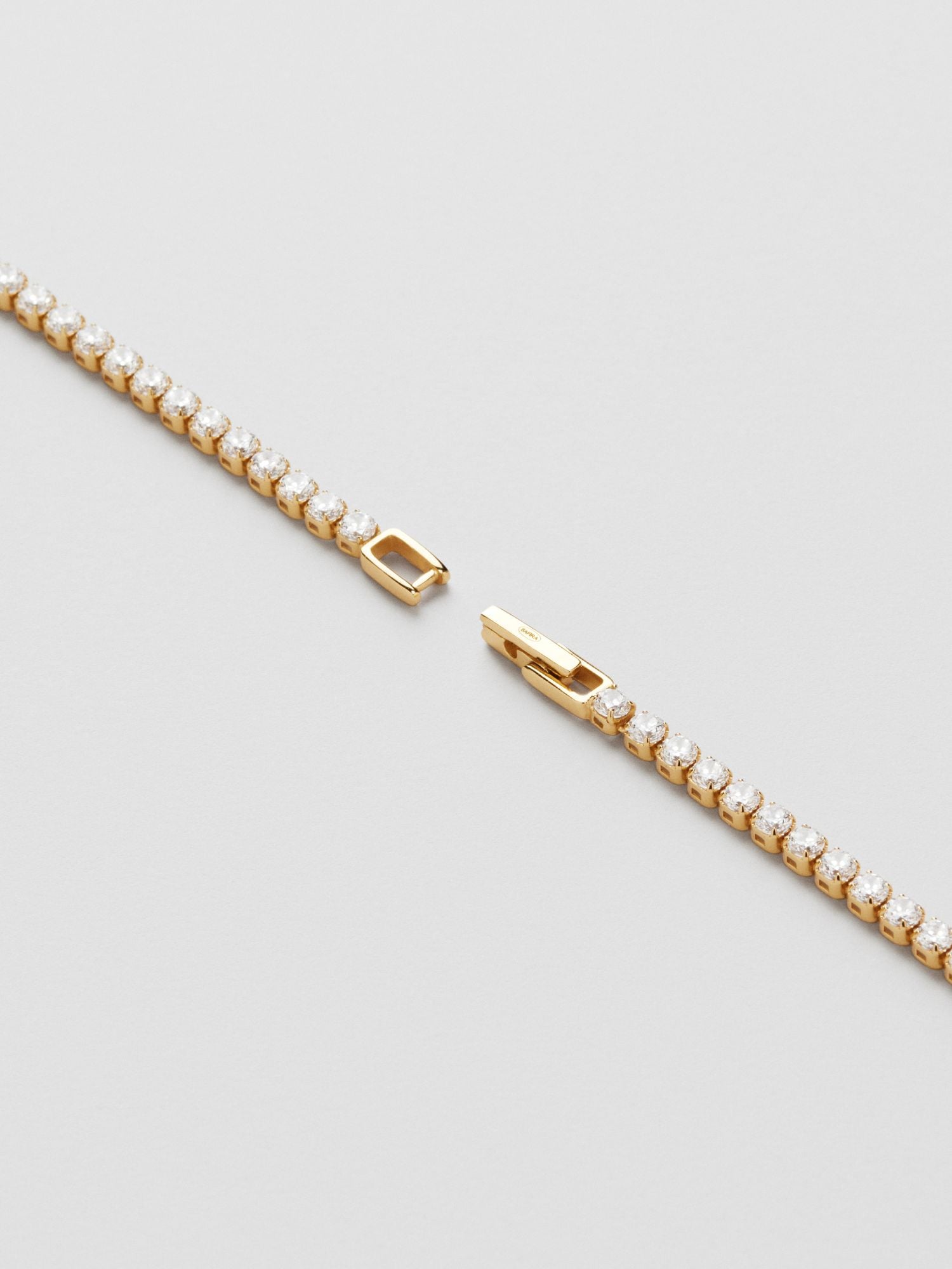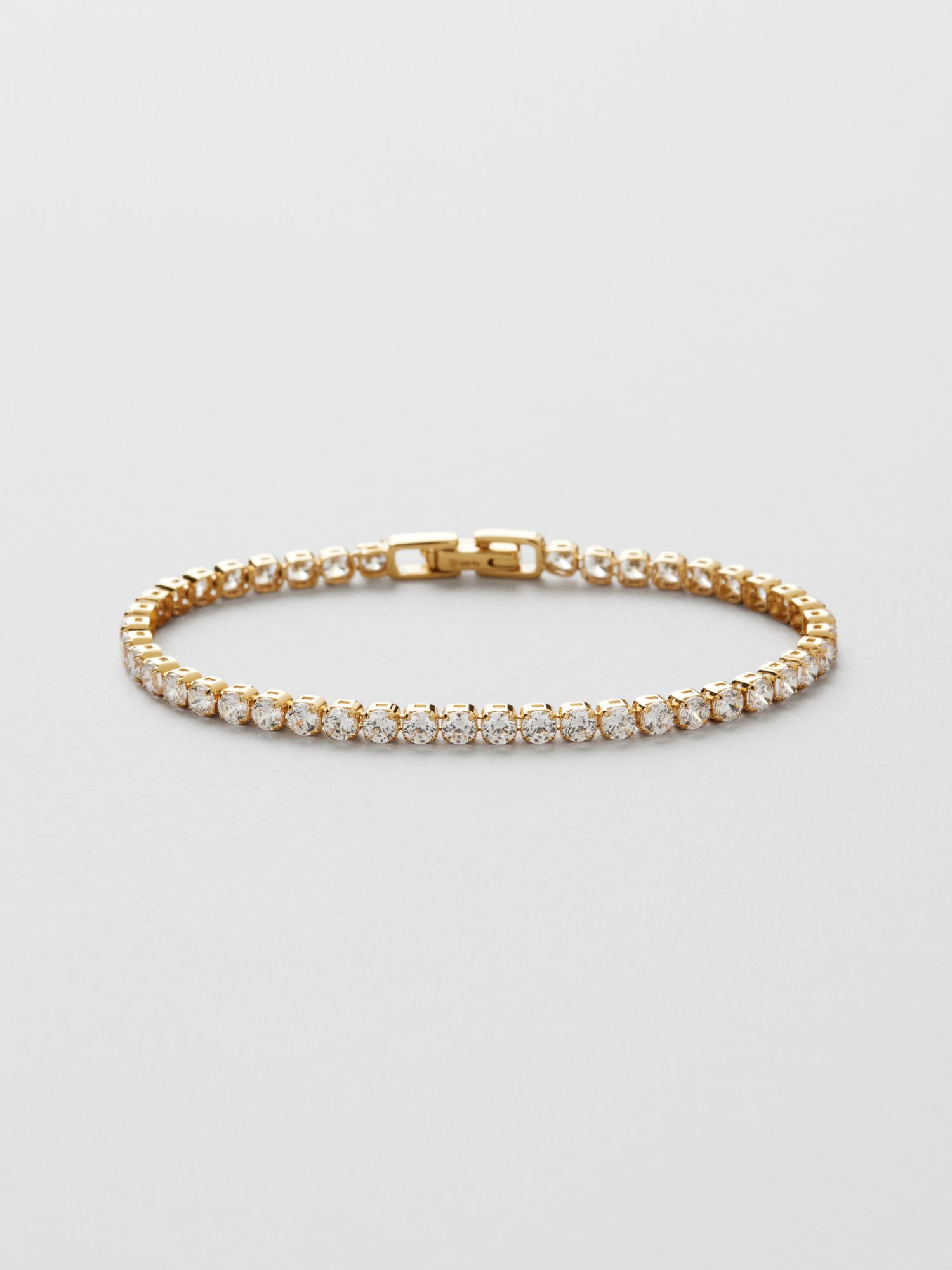 Tennis bracelet in genuine 925 sterling silver, adorned with clear Cubic Zirconia stones. The gold bracelet is plated with genuine 18K gold and has a core of genuine 925 sterling silver. This product is made from 100% recycled silver.