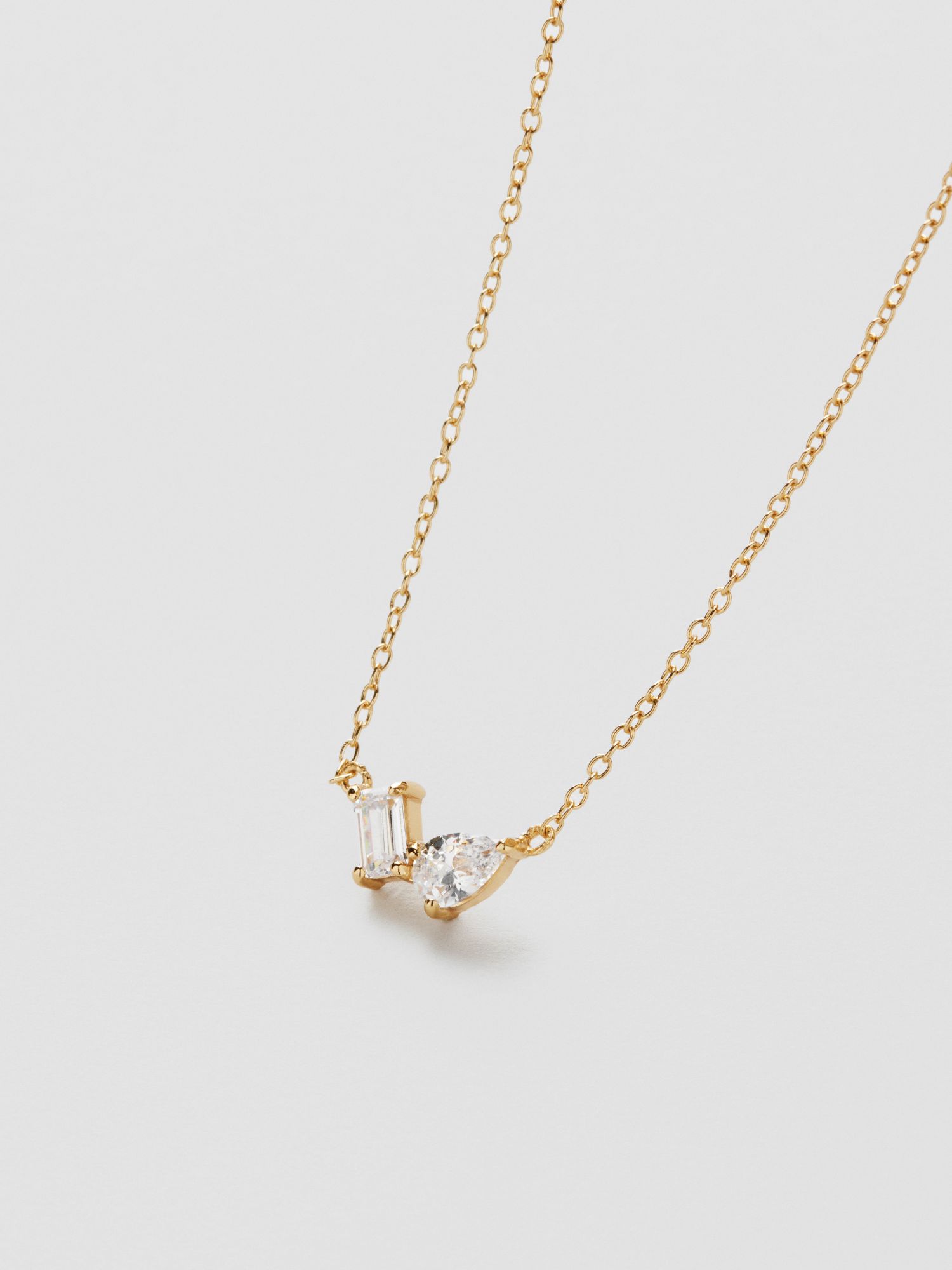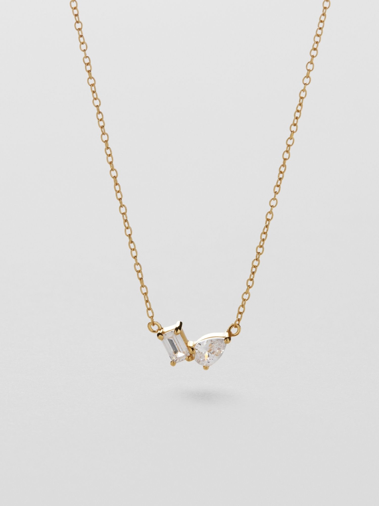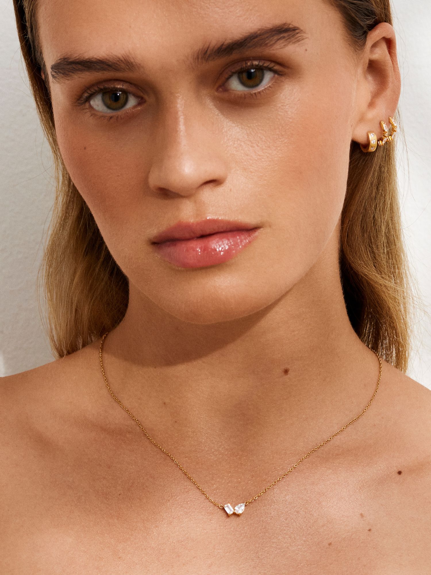 Necklace in genuine 925 sterling silver, decorated with two clear Cubic Zirconia stones. "Toi et Moi" means "You and Me" in French. The gold necklace is plated with genuine 18K gold and has a core of genuine 925 sterling silver. This product is made from 100% recycled silver.